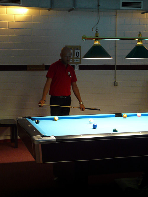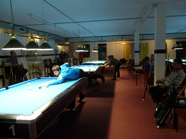 Gestartet wurde Freitags abends mit der ersten Vorrundengruppe, die wie alle weiteren Vorrunden (Samstags um 15 Uhr und Sonntags um 10 Uhr) im gleichen System gespielt wurde: Vier Gruppen à fünf Teilnehmer wurden gebildet, innerhalb der einzelnen Gruppe spielte jeder gegen jeden 10-Ball, Best of 7 mit Wechselbreak. Somit schied auch kein Spieler – wie ansonsten bei Doppel-K.O.-Turnieren üblich – nach möglicherweise nur zwei Spielen aus, sondern jeder Teilnehmer spielte mindestens vier Sätze. Ausserdem wurde darauf geachtet, das sich möglichst viele Spieler für die Endrunde qualifizierten. So kamen neben den ersten beiden Plätzen jeder 5er Gruppe auch noch die besten drei (bzw. Sontags nur zwei) Drittplatzierte in die Endrunde. Freitags und Samstags ging unser Zeitplan genau auf, die eingeplanten maximal 5 Stunden für einen Vorrundentag schienen gut kalkuliert. Leider klappte es am Sonntag nicht so ganz, so mussten die angereisten Endrundeteilnehmer auf die letzten Qualifizierten rund 50 Minuten warten. Wir hoffen, das war noch im Rahmen.